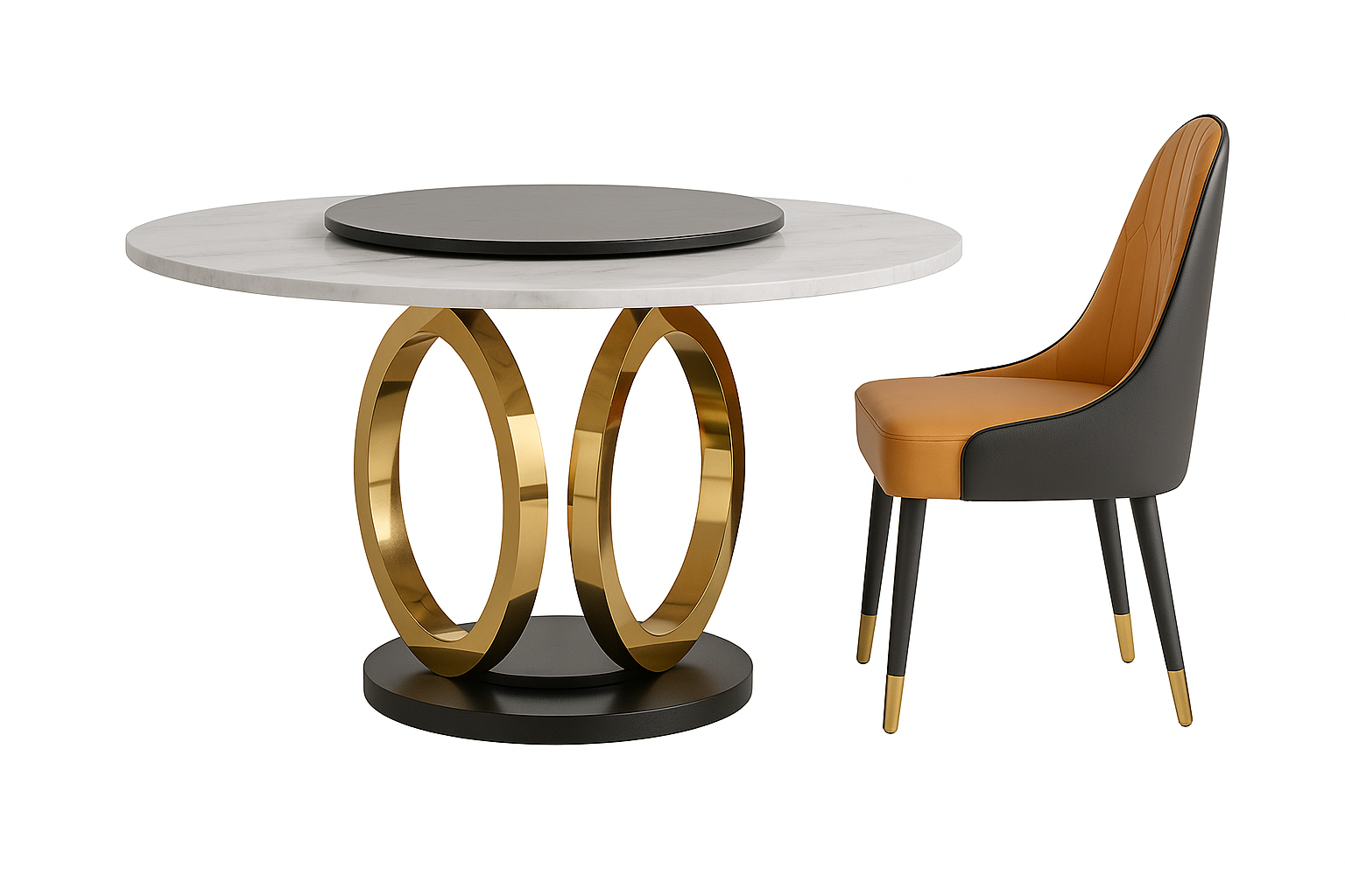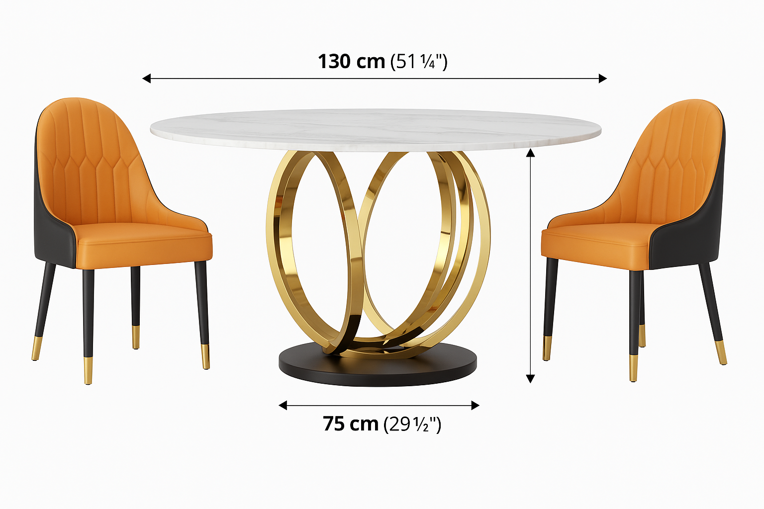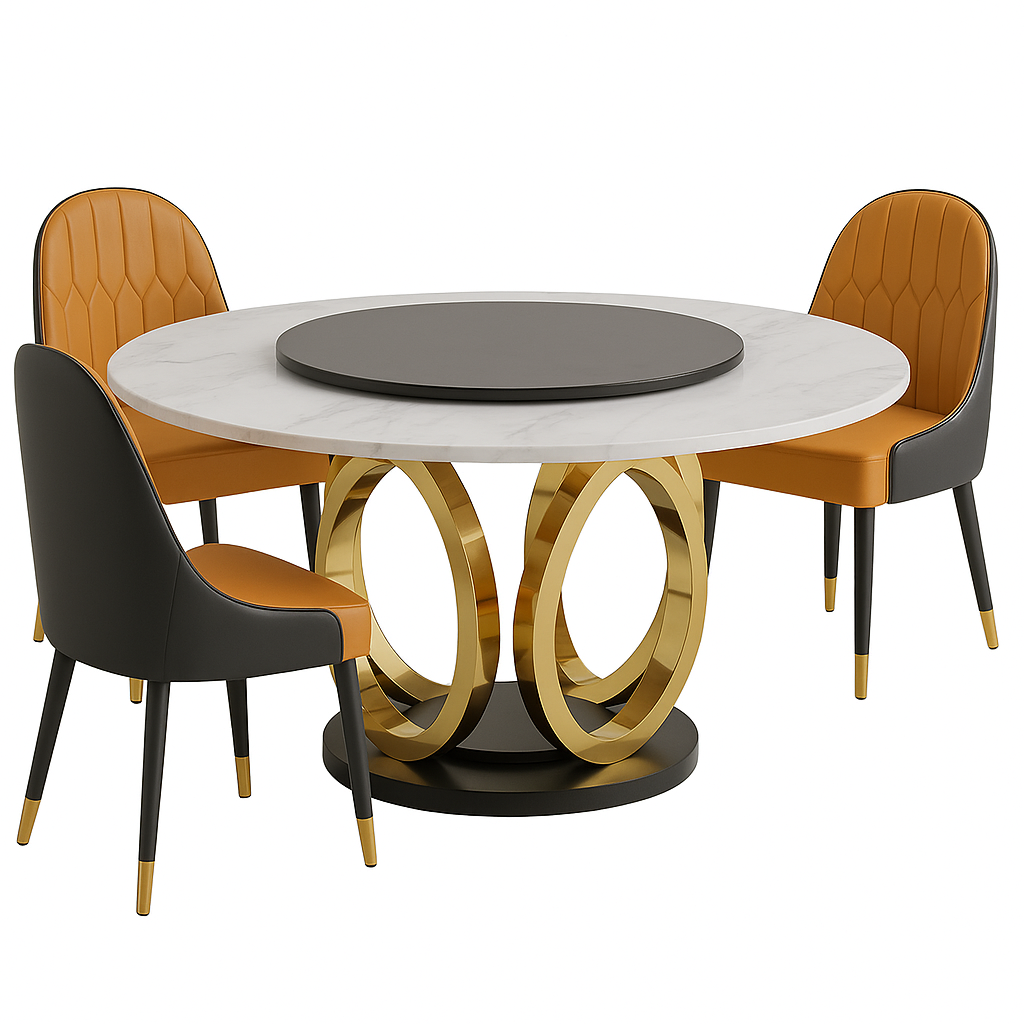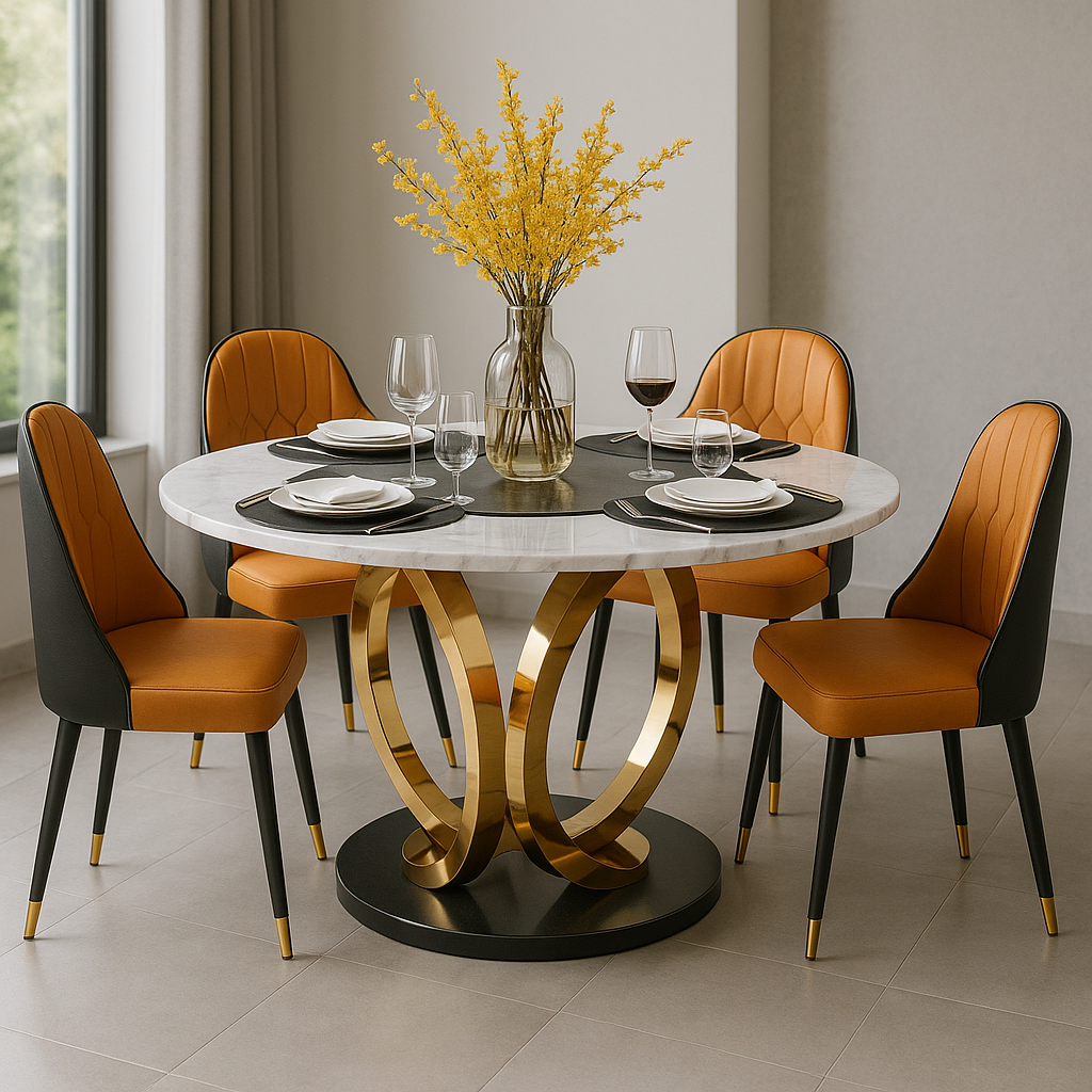 Ronde Eettafel Set – 6 Stoelen – Marmerlook Tafelblad Ø135 cm – Goud RVS Onderstel – Eetkamerset – Montageklaar